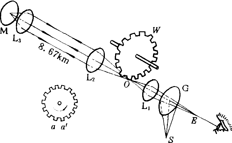 图1 1849年,法国物理学家A.H.L.斐索用齿轮法首次在地面实验室中成功地测量出光速。他的实验装置如图所示。由光源S发出的光束在半镀银镜G上反射经过透镜L1会聚在齿轮W的齿a和a′之间空隙内的o点,再经过透镜L2变成平行光束。经过8.67千米(km)的距离后通过透镜L3会聚在镜M上,反射后由原光路返回到G后进入人眼。齿轮旋转时,齿将光束切割为许多短脉冲。斐索用齿数为720的齿轮,使转速为25转/秒,因此,从齿a转到齿a′所用的时间即为1/720×25秒。这相当于每个光脉冲往返所用时间为1/18000秒,往返距离为17.34千米,由此可得到光速为312 000千米/秒。但是该实验中不易精确地测定像消失的瞬时,影响了测量的精度。以后,人们多次改进实验方法,以求能精确地测量时间。1850年,法国实验物理学家傅科用旋转镜代替旋转齿轮测光速,得到光速值为298 000千米/秒。首次测出光在水中的速度小于在真空中的速度,成为波动说战胜微粒说的一个重要实验依据。1926年,美国实验物理学家A.A.迈克耳孙用一个八面体旋转镜代替了齿轮和平面旋转镜。测得光速的平均值为299 796千米/秒。1928年起,又有人用克尔盒法测定光速。克尔盒是能控制光束强度以极高频率变化的光学部件,以它代替旋转镜。