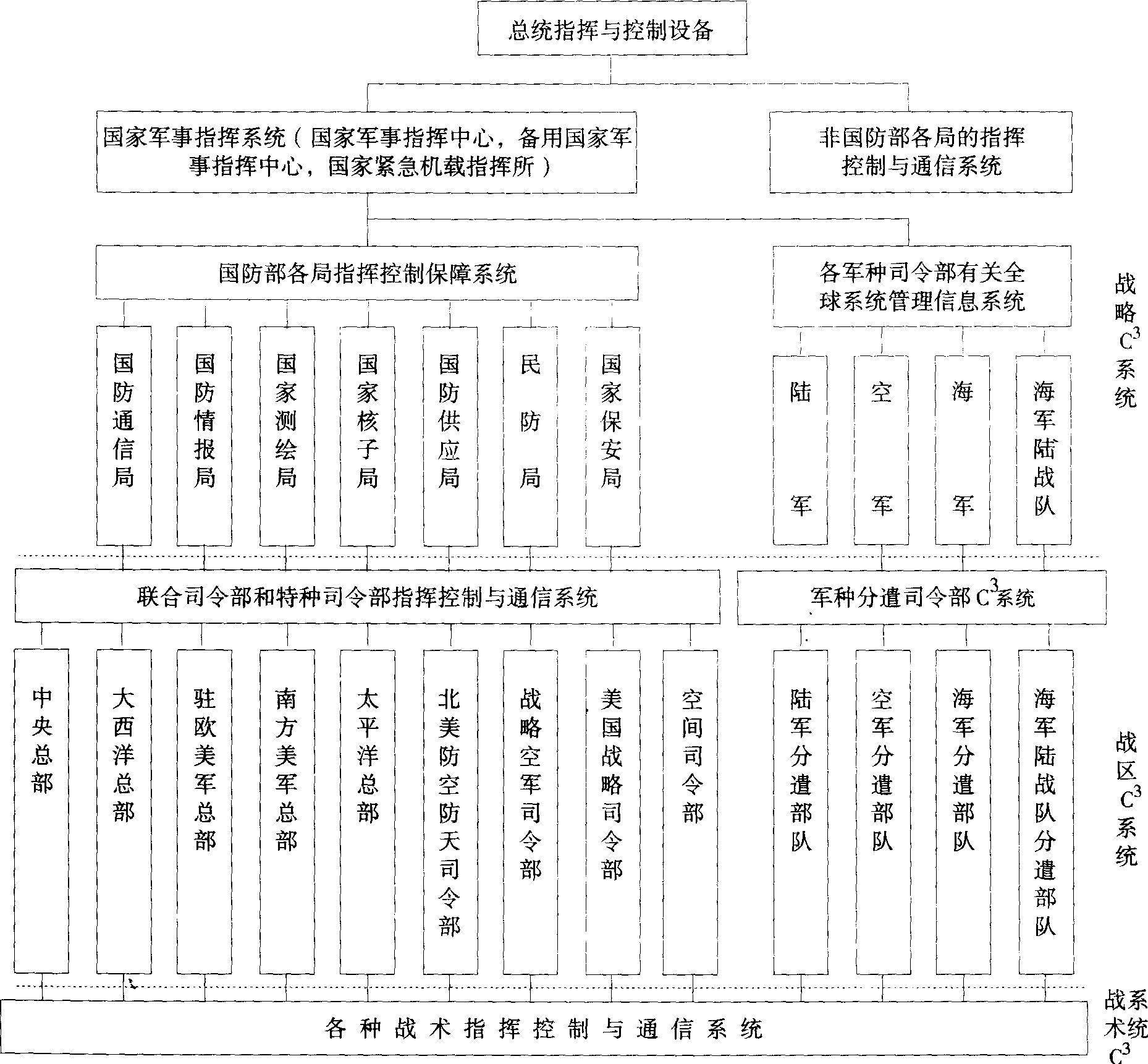 | 释义 | 全球军事指挥控制系统美国战略C3 Ⅰ系统的全称。主要任务是保证美国国家指挥当局在平时、危机时和全面战争的各个阶段都能不间断地指挥控制美国在全球各地的战略部队。 全球军事指挥控制系统 全球军事指挥控制系统quanqiu junshi zhihui kongzhi xitongworld-wide militarycommand and control system, WWMCCS美国的战略C3I系统。它始建于1962年,其主要目的是把当时各军种以及国家指挥当局各自为政的C3I系统统一起来,组成金字塔式结构的全球军事指挥控制系统。其组成如附图所示。