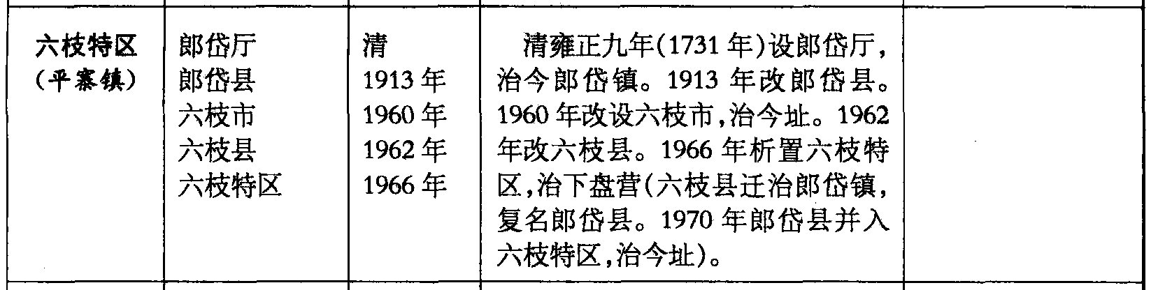 六枝特区(平寨镇)郎岱厅郎岱县六枝市六枝县六枝特区清1913年1960年1962年1966年清雍正九年(1731年)设郎岱厅,治今郎岱镇。1913年改郎岱县。1960年改设六枝市,治今址。1962年改六枝县。1966年析置六枝特区,治下盘营(六枝县迁治郎岱镇,复名郎岱县。1970年郎岱县并入六枝特区,治今址)。