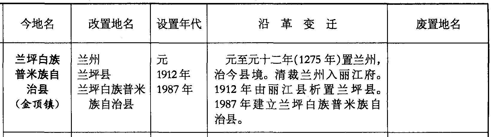 兰坪白族普米族自治县(金顶镇)兰州兰坪县兰坪白族普米族自治县元1912年1987年元至元十二年(1275年)置兰州,治今县境。清裁兰州入丽江府。1912年由丽江县析置兰坪县。1987年建立兰坪白族普米族自治县。