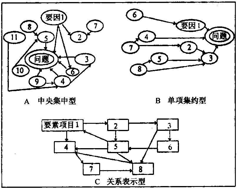 给出关系R,因选取代表元素的点的位置不同,会得到表面形象上不相同的关系图.当然,它们刻划的是同一个关系:不仅点数、边数一样多,并且点之间是否有有向线相联是完全相同的. 由关系R的关系图,将所有有向线改变方向就得到逆关系Rc的关系图. ☚ 关系 关系矩阵 ☛ 关系图 关系图Relationship-Diagram Method用箭头线表示事物之间因果关系的一种连线图(关系图),也称为关联图法。关系图法是一种群体解决问题的方法。确定了所要解决的问题后,要由若干个成员组成一个小组,由全体成员多次反复构画关系图。在这一过程中充分发挥创造性思维,利用关系图明确各种复杂的因素之间的因果关系,小组就问题形成共识,最终找到解决问题的对策。关系图法在质量管理中主要应用于以下一些方面:(1)制定企业开展全面质量管理活动的规划;(2)质量方针的设定与展开;(3)制造过程中的质量改进,特别是提出解决潜在质量问题的对策;(4)推动QC小组活动;(5)解决顾客投诉的问题;(6)改进企业的业务活动;(7)解决在交货期管理、过程管理方面存在的问题。