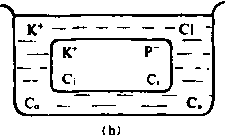 (a)细胞内有非扩散离子P-的盐类(例如为蛋白质的钾盐); (b)将细胞置KCl溶液中;(c)达杜南平衡时,K+在细胞内积累Ci细胞内的离子浓度;C0细胞外的离子浓度;x细胞外扩散到细胞内的离子浓度