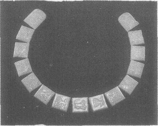 | 释义 | 兽纹玉带板 兽纹玉带板唐。长3.5—5厘米。1970陕西省西安市何家村窖藏出土,陕西省博物馆藏。带板又名銙,缀在腰带上做为饰件。《唐实录》载:“高祖始定腰带之制。自天子以至诸侯、王、公、卿、将、相二品以上许用玉带。”由此可知,唐代开始实行玉带之制,一直延续到明代。此副玉带板为青玉所制,保存完整,包括十三块方形胯和两块铊尾。按唐代制度,三品以上人员才能着十三銙的玉带。每块板上均以浅浮雕饰一动物,并以阴线加饰细部,动物的形象各不相同,或立、或卧、或走,个个生动。每块皆有钉孔供结扎。这种雕饰动物的玉带板极为罕见。