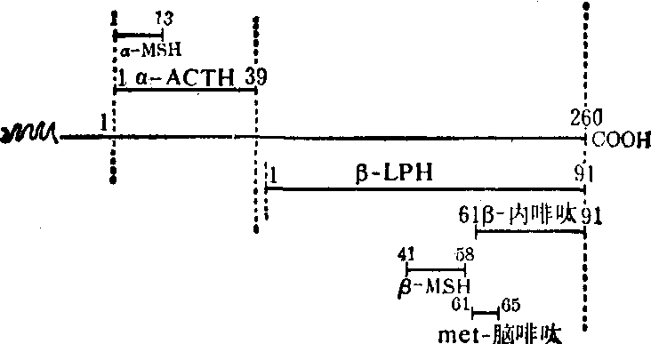 此外,近年来尚发现下列神经肽类激素,包括神经降压素,P物质,肾素,血管紧张素,脑啡肽,内啡肽,蛙皮素,胃泌素,胰酶素,舒血管肠肽(VIP)。但除神经降压素及P物质外,均仅用免疫化学或免疫组织化学法鉴定,且大多数亦由胃肠胰岛分泌,故将在后面介绍。 垂体激素 垂体前叶分泌下列几种激素 (1)促甲状腺激素 (TSH):由垂体前叶促甲状腺激素细胞所分泌,系一种糖蛋白,分子量28,000,由α及β二个亚单位组成。α亚单位与FSH、LH及人绒毛膜促性腺激素(HCG)相似,对这些激素抗血清呈交叉免疫反应;β亚单位呈生物特异性。临床上用放射免疫法测定TSH血清基值为0~4μu/ml,平均1.0μu/ml,正常人中约有10~20%的基值为0(即用现有方法测不出)。血浓度有昼夜周期节律变化。主要受TRH节律性分泌调节,和T4、T3的反馈调节。 (2)促性腺激素(Gn): 有二种: 卵泡刺激素(FSH)及黄体生成激素 (LH),后者又称间质细胞刺激素(ICSH)。二者均属糖蛋白类激素。羊FSH由236个氨基酸组成,分子量为32,000道尔登。羊LH由215个氨基酸组成,分子量为30,000道尔登。FSH有刺激卵巢中卵泡成熟及睾丸生精作用。LH则主要能刺激黄体生成与睾丸中Leydig细胞。在二者协同作用下可刺激卵泡细胞分泌雌激素,其中主要为雌二醇。此二种激素在泌乳素的协同作用下调节与维持女性激素周期性变化。男性激素分泌虽无周期性变化,但FSH基础水平及对GnRH的反应与精子生成和成熟有关,当生精作用发生障碍时,FSH常增高。ICSH能刺激Leydig细胞分泌睾酮,后者又在睾丸内起调节精细管生精作用。此二种激素受LRH及性激素反馈调节。正常值随年龄性别而异。 (3)促肾上腺皮质激素(ACTH):由39个氨基酸组成,人ACTH分子量为4507道尔登。在人垂体提液中,ACTH与β-促脂素(β-LPH),属阿片-黑素-促皮质素原(POMC)的一部分。ACTH中N-端的1~13个氨基酸为α-黑素细胞刺激素(α-MSH),提示ACTH过多时引起黑色素沉着与此结构有关。ACTH由垂体前叶ACTH细胞分泌,其主要作用为刺激肾上腺皮质增生肥大,分泌增多,尤以束状层及网状层为主,球状层虽亦有影响,但主要由肾素-血管紧张素系统与钾离子调节。正常人ACTH分泌有昼夜周期性节律变化,以清晨8点钟前最高,午夜24~2点钟最低。近代用放射免疫法测定血浆基值,正常人上午10:00点为10~80pg/ml,至午夜降至10pg/ml以下。ACTH分泌受CRH(或CRF)、皮质醇及应激反应等精神神经因素的调节。周期性节律主要受CRF的调节。 β-促脂素系91个氨基酸组成的多肽,其羧基端61~91为β-内啡肽,41~58为β-MSH,61~65为甲硫氨基酸脑啡肽。β-促脂素有促进脂肪动员分解为游离脂肪酸等作用。β-内啡肽、脑啡肽具有镇痛等作用,与阿片受体结合且呈类似阿片的作用,故名。此组物质是否为激素抑属神经递质尚有争议。其中关系见图。