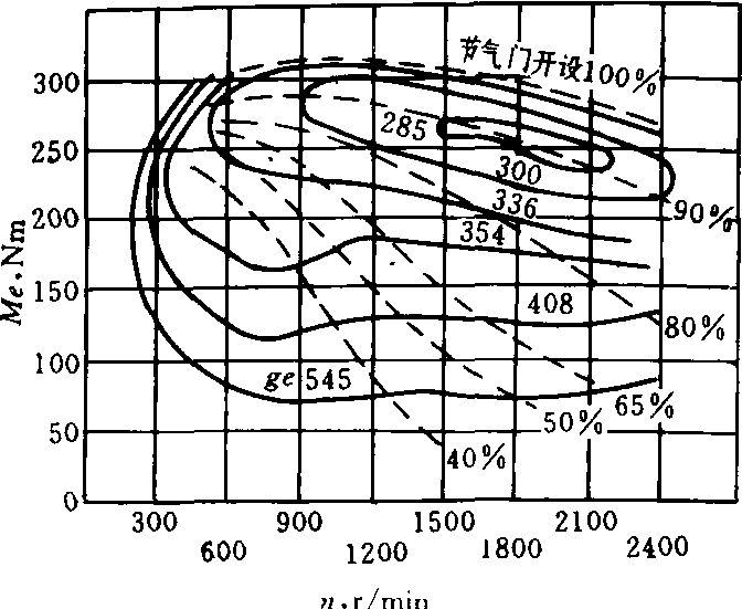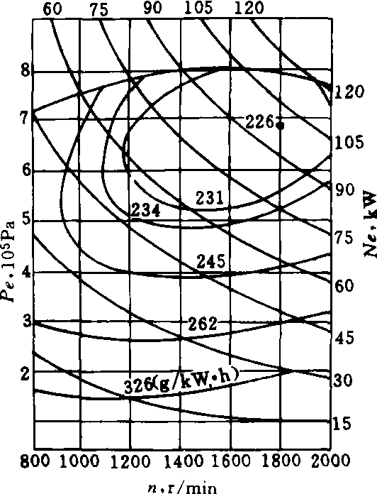 内燃机万有特性universal characteristics of internal cornbustion engine在一张图上全面表示内燃机性能的多参数特性曲线。由于车用内燃机工况变化范围很广,要分析各种工况下的性能就需要许多负荷特性和速度特性,很不方便。应用最广的万有特性是以转速作横坐标,平均有效压力作纵坐标,在图上画出等比油耗曲线和等功率曲线,组成一群曲线族。从万有特性曲线上,很容易看到内燃机最经济的负荷和转速。最内层的等比油耗曲线相当于最经济的区域。对于车用内燃机,希望最经济区最好在万有特性的中间位置,使常用转速和负荷落在最经济区域内。汽油机万有特性曲线(图2)与柴油机万有特性曲线(图1)相比,其最经济区偏上,柴油机则比较适中,而且汽油机的比油耗比柴油机的高得多。由于汽车经常在低负荷下工作,而汽油机在此区域内油耗增大较快,所以车用汽油机的燃料经济性差。研究如何提高车用汽油机实际使用燃料的经济性,具有很大的经济意义。