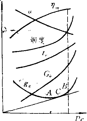 内燃机转速保持不变,主要性能指标随负荷变化的关系。负荷特性曲线是以负荷(有效功率或平均有效压力)为横坐标,以主要性能参数(比油耗ge,耗油量Gb、排气温度tr、烟度,机械效率ηm)为纵坐标绘制而成的。负荷的变化在柴油机中是改变每循环的供油量(变质调节),在汽油机中是改变节气门开度(变量调节)来进行的。当内燃机保持不同转速时,分别得出相应的一组负荷特性曲线。一般测定标定转速下的负荷特性。负荷特性是柴油机最主要的特性。从柴油机负荷特性图中可见到每小时耗油量Gb随负荷增加而增大,基本为一直线;耗油率的变化则是一条向下弯的曲线,曲线的最低点(A点)是经济性最好的最小油耗点;排气烟度随负荷增加而增大,在B点处由于燃烧恶化,烟度急剧升高,一般将此点作为冒烟极限,柴油机不允许在冒烟极限下工作。A点ge最低,但功率最小;B点功率高,但ge也高。一般从坐标原点作一射线与ge曲线相切得切点C,C点的功率与油耗之比值最大。这点的位置,作为柴油机标定功率的参考。
