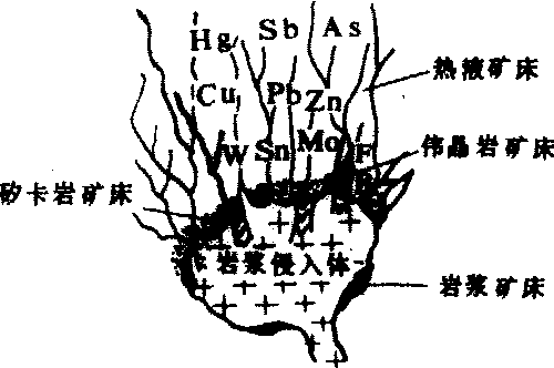 内生矿床示意图 岩浆矿床是指在岩浆的主要成分结晶过程中由岩浆分异所形成的,这种矿床往往形成在深成母岩中。当岩浆温度下降到一定程度便开始结晶,由于各组分熔点不同,使结晶过程有先有后,各组分按照一定顺序结晶的过程,叫做结晶分异作用。在结晶分异作用过程中,因重力作用,从岩浆中析出的晶体,重者下沉,轻者上浮,从而使有用组分发生富集。在分异过程中,如果有用矿床的形成早于母岩或者同时形成,这种矿床称早期岩浆矿床。这种矿床主要存在于橄榄岩、蛇纹岩等超基性岩中。 岩浆的成分很复杂,在高温高压条件下可以混熔在一起。但当岩浆侵入,温度压力下降或者由于岩浆中某些组分的进入或逸散,可以使岩浆逐渐分离成几种成分不同、不相混熔的岩浆,这种作用称熔离作用(液态分异作用)。因熔离作用富集而形成的矿床,叫熔离矿床。 岩浆中含有大量熔点低、挥发性强的物质,特别是一些卤素酸,常和金属元素Au、W、Sn、Mo、Pb、Zn、Cu、Hg等结合,形成挥发性卤化物。虽然这些金属元素本身在岩浆中的含量很低,但一经和挥发性成分相结合,则可大大地促进其迁移和富集,形成有用矿床。一般越到岩浆结晶晚期,岩浆中所富集的挥发性成分和所集中的金属成分就越多,最后形成含矿熔浆。这部分熔浆在适当条件下形成矿床,称为晚期岩浆矿床。 由于火山喷发,把含有早期结晶的有用矿物的岩浆喷出地表或接近地表,形成一些特有的矿床,这类矿床叫做喷发岩浆矿床。例如,形成于上地幔的超基性岩浆,在高温高压条件下结晶出金刚石,后来沿深断裂上升并冲破上覆岩层,把含有金刚石晶体的岩浆充填于火山管道中,形成金刚石矿床。著名的南非金刚石矿床和我国山东、辽宁、贵州等金刚石矿床都属喷发岩浆矿床。 由于岩浆的分异作用,使岩浆中不断地失去某些成分,而另外一些成分则相对富集起来,如硅酸、水汽和挥发性金属化合物在残浆中相对富集。由于挥发性物质的相对富集,一方面使残浆的内压力增加,使它能够侵入到母岩或围岩的裂隙之中,形成岩脉;另一方面它使残浆的粘度和结晶点温度降低,这样既利于残浆中物质质点的自由活动,又有充足的结晶时间,可以形成巨大的晶体。例如,曾记录过重100吨的钾微斜长石晶体,40吨重的石英晶体,黑云母晶体达7平方米,白云母达30平方米,我国新疆产的绿柱石晶体有50吨重。侵入到母岩及围岩裂隙中的残浆往往形成晶粒粗大的伟晶岩脉,其中有用矿物富集的岩脉,构成伟晶岩矿床。伟晶岩矿床中经常聚集钨、锡、钼、锂、铍、铌、钽、铷、铯、锆、铀、钍、钇、铈、镧等稀有元素和稀土元素。 在岩浆分异的后期,岩浆中的主要成分硅酸岩和氧化物大部分结晶后,岩浆中的大量气体和含矿气水溶液的活动,使有用组分沿裂隙上升,并在适当部位冷凝形成矿床,叫气化热液矿床,也叫岩浆后期矿床。它在内生矿床中占有重要地位,绝大部分有色金属、稀有金属和分散元素、放射性元素、部分黑色金属及许多非金属矿产都来自这类矿床。气化热液矿床主要有:矽卡岩矿床、火山气液矿床和热液矿床。从岩浆中分泌出来的气体和热水溶液与围岩发生接触交代而形成的矿床叫矽卡岩矿床,也叫接触交代矿床。火山喷发后期,火山喷气和热液活动仍很强烈,这些气体和热液中常含有大量金属化合物,在一定地质、物化条件下,气液与围岩或气液之间相互作用,使有用组分富集起来形成矿床,称为火山气液矿床。岩浆分异后期,岩浆中的含矿气体和热液沿着围岩裂缝上升,由于温度和压力逐渐减低,使其中的有用组分依次冷凝沉淀所形成的矿床,称为热液矿床。根据形成条件又可分为: 高温热液矿床——形成温度在500~300℃之间,成矿深度约1.5~4.5公里,矿体多位于花岗岩等侵入体附近;中温热液矿床——形成温度在300~200℃之间,成矿深度约为1.5~3公里,矿脉多距侵入体较远;低温热液矿床——形成温度在200~50℃之间,成矿在地表附近,矿体多发现于距侵入体很远的沉积岩中。 ☚ 矿床的分类 外生矿床 ☛ 内生矿床由内生成矿作用所形成的矿床。通常包括岩浆矿床、伟晶岩矿床、接触交代矿床、热液矿床和火山—次火山成因矿床等。 |
