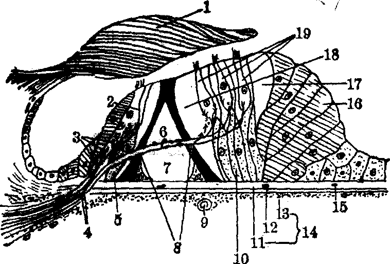 图3 行波在基底膜上的传布(示意图) 基底膜不同部位的共振频率不同,在其相应频率的声波作用下,产生一最大振幅区,该区域的毛细胞与听神经受到的刺激最强,兴奋沿不同部位的听神经纤维传到听觉中枢的不同部位,产生不同的音调感觉。这就是耳蜗对声音频率的初步分析。但仅仅依靠耳蜗的分析能力是很难达到较高的分辨水平,中枢神经系统在分辨频率的过程中起重要作用。 毛细胞的顶端镶嵌在网状板的网眼中,毛细胞中较长的纤毛穿过其顶部的表皮板而埋植在盖膜的胶冻状物质中。当行波引起基底膜向上或向下移动时,盖膜与网状板之间发生交错移行运动,两膜之间产生一种切向力,使一端埋植在盖膜中的纤毛发生弯曲,因而引起毛细胞兴奋(图4)。 关于毛细胞的功能,近年来从电镜观察到毛细胞在结构方面的特点,这对其功能的了解具有重要意义。毛细胞顶端的表皮板下面有许多线粒体、小泡及微粒等细胞器,表明该部位代谢功能旺盛。毛细胞的神经支配包括传入神经末梢和传出神经末梢两种。在毛细胞底部与神经末梢间形成突触的地方亦有大量的细胞器聚集。毛细胞的顶部与底部是细胞功能最活跃的部分,顶部可能是对机械能反应最敏感和接受刺激的地方。 鱼类侧线器官中的毛细胞具有感受低频振动的功能,是听觉器官的原始雏型,为研究振动感受器兴奋与换能过程提供了有利条件。从研究鱼类侧线器官功能所获得的资料,对说明哺乳类毛细胞的功能有重要参考意义。侧线器官中的毛细胞有静纤毛与动纤毛两类,纤毛弯曲的方向与毛细胞的兴奋与抑制过程有密切关系。生物电研究证明,当静纤毛朝向动纤毛的方向弯曲时,引起毛细胞的去极化(细胞的膜电位降低),同时传入神经冲动的发放增加,表现为兴奋效应。当静纤毛背离动纤毛弯曲时,引起毛细胞超极化(膜电位增大),同时神经冲动的发放减少。这一事实直接证明纤毛的弯曲与振动感受器的活动有着密切的联系。