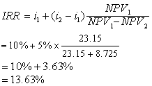 例:某项目期初(第1年年初)固定资产投资100万元,投产时需流动资金投资20万元。该项目从第3年初投产并运行,每年需运营费40万元。若项目每年可获销售收入65万元,项目服务年限为10年,预计残值20万元,设折现率为10,求净现值。 先取i2=10%,计算如下: NPV1=-100-20×(P/F,10,2)+(65 -40)×(P/A,10,10)×(P/F,10,2) +(20+20)×(P/F,10,12) =-100-20×0.8264+25 ×6.144×0.8264+40×0.3186 =23.15(万元) 再取i2=15%,计算如下: NPV2=-100-20×(P/A,15,2)+(65 -40)×(P/A,15,10)×(P/F,15,2) +(20+20) ×(P/F,15,12) =-100-20×0.7562+25×5.2337× 0.7562+40×0.1869 =-8.725(万元) 因此: ![]() 即该项目的内部利率为13.63%。 动用内部利率法评价投资方案的规则是,在只有一个备选方案的采纳与否的决策中,如果计算出的内部利率大于或等于资金成本或期望报酬率,就可接受该方案,反之应拒绝。在多个方案中,则应选择内部利率最高的投资方案。 ☚ 年费用法 外部收益率法 ☛ 内部利率法internal rate of return method |