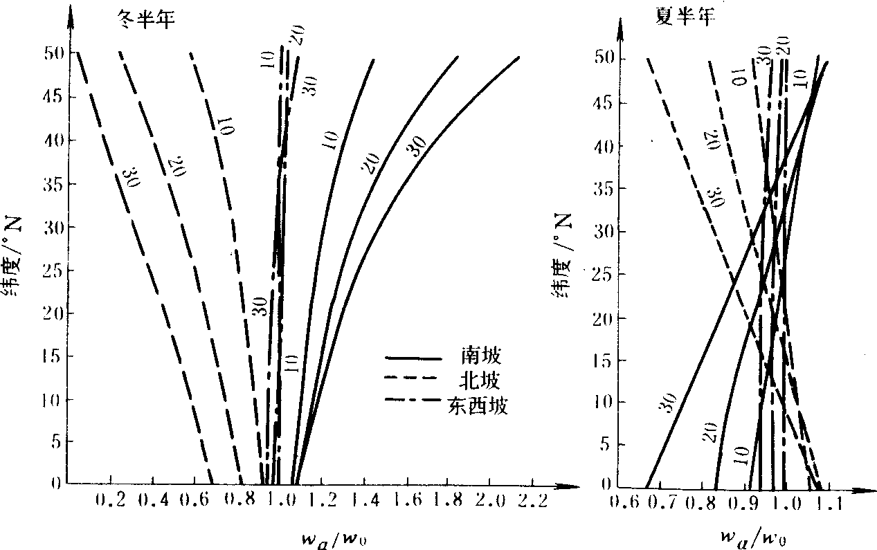 图1 北半球坡地上的可能直接辐射总量Wa与平地上的可能直接辐射总量W0的比值Wa/W0随坡向、坡度及纬度和季节的变化(曲线上的数字代表坡地的坡度) 不同方位坡地上的温度差异,主要是由辐射的差异而引起,在其他条件相似的情况下,凡是接受太阳辐射少的坡地,其温度也低;凡是接受太阳辐射多的坡地,其温度也高。因此,坡地上温度随坡向、坡度及季节和纬度而变化的规律,一般是与坡地上的辐射变化相类似,而且气候愈干燥、植被愈稀少、天气愈晴稳,不同方位之间的温度差异愈显著。但是由于不同坡地上的风速差异很大,特别是在大地形下, 云雾和降水的差异,会在不同程度上加强或减弱这种由于辐射分布特点所造成的温度差异。在中纬度地区,就相对高度差几十米到二、三百米的中等坡度的小地形来说,南坡的平均气温在冬季可比北坡高1~2℃,在夏季一般只高零点几度,东坡和西坡的温度介于南坡和北坡之间,而与平地相接近。但随着地形尺度增大,不同方位之间的温度差异也相应增大。冬季,特别是有冷平流时,南北坡地的温度可以相差好几度。坡地方位对土温的影响比对气温的影响要大得多,在冬季晴天南坡表层土壤的平均温度可比北坡高4~6℃, 比平地高3~4℃,地面最高温度南坡可比北坡高十多度,最低温度可比北坡高3~5℃(图2)。 坡地方位对湿度的影响比较复杂,对足以影响天气系统或过程的大地形来说,一般是向风坡降水多,湿度大,背风坡降水少,湿度小。但是高度不大的地形,因为对降水本身影响不大,其土壤湿度和空气湿度的相对大小主要决定于蒸发的强弱以及降水的分布和地面保水情况。所以在小地形中,坡地方位对土壤湿度的影响, 一般正好与对太阳辐射的影响相反。凡是接受太阳辐射多、温度高的坡地,因为蒸发能力强, 土壤水分消耗快,其土壤湿度一般都比较小;凡是接受太阳辐射少,温度低的坡地, 由于蒸发能力弱,土壤水分消耗慢,其土壤湿度一般都比较大。坡地方位对空气湿度的影响与气候条件有关,在气候湿润的地区,因为各种坡向土壤水分都比较充足,坡地上的蒸发主要决定于热力条件,所以接受太阳辐射多的坡地,随着蒸发到空气中的水汽多,其空气湿度也大。反之, 则小。在气候比较干燥的地区, 由于接受太阳辐射多的坡地,土壤湿度小,其蒸发能力虽强,但实际蒸发到空气中的水汽少,空气湿度就反比接受太阳辐射少,而土壤湿度较大的坡地小,特别是相对湿度在上述两种坡地上,可出现很大的差异。