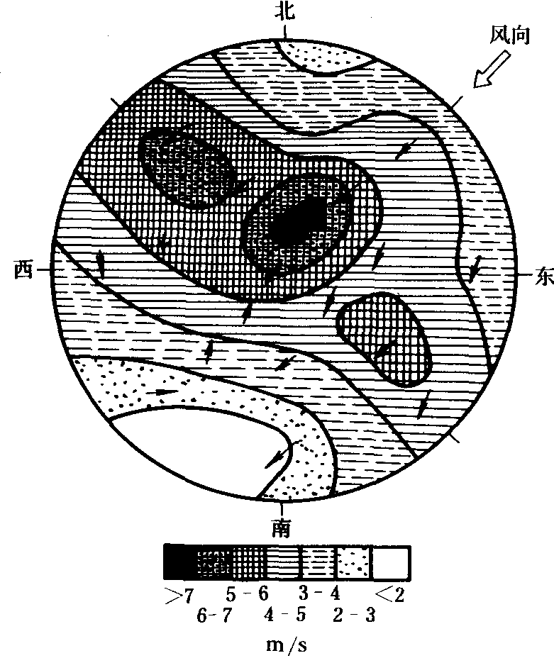 图 3 小山岗的风速分布 地形对风速影响的规律一般是: 凸出地形的顶部风速最大, 侧风坡的中部其次, 向风坡又次之, 背风坡和低洼地形的底部风速最小(图3), 且地形对风速影响的程度和距离是背风面大, 向风面小。在比较平直的河谷内, 当一般环流风近乎垂直河谷吹时, 由于气流受阻, 河谷内的风速照例是比平地减小; 当风近乎平行河谷吹时, 由于流区压缩, 产生 “狭管效应”,河谷内的风速要比平地增强, 风向和河谷走向交角愈小, 风速增强愈多。河谷愈深愈窄, 河谷内风速的减弱或增强愈厉害。在山地、在晴稳的天气下, 常见山谷风和坡风(见山谷风)。地形相对高度愈大, 地面植被愈低矮稀少, 山谷风和坡风的强度愈大。 对大地形来说, 降水的分布一般是向风坡多, 背风坡少。但在一般像小山岗和丘陵地之类的起伏地形中, 由于地形高差不大, 对气流上升运动影响有限,其降水的分布主要受风的影响,风速大的地方降水少,风速小的地方降水多。 |