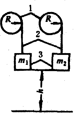 JM=Ja-Jd (8) 式中 Ja为全机组的惯性矩。重物降落法 在生产机械的驱动轮(半径为R米)上缠绕绳索,绳索的自由端系以重物,为了确定生产机械的惯性矩,也要作两次加速试验,试验时所系重物质量分别为m1及m2,以产生大于阻转矩的恒定转矩(图5)。 试验时,放开重物,使在h距离内获得加速,两次试验相同,分别记录所需时间t1及t2。重物加速为: a1=2h/t12;a1=2h/t22 机械回转部分折算为直线运动的质量(千克)为:mx=[m2(g-a2)-m1(g-a1)]/(a2-a1) (9) 生产机械的惯性矩即为:Jx=mx·R2 (10)