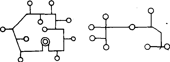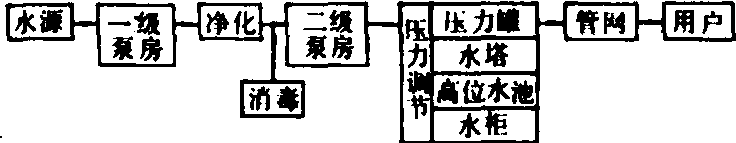 图1 工艺流程 取水设备 主要是水泵。根据水源情况和所需流量、扬程来选择水泵的类型和规格(见泵站设备、井泵装置)。 水净化处理装置 由沉淀池和过滤池组成。沉淀池多为平流式,池体是长方形、斜底,底部设有排泥和冲洗孔,进、出水管均设在沉淀池上部。过滤池是由滤料、承托格栅、穿孔配水管、进水管、排污管、清水出水管等组成,分快、慢两种。慢滤池由水层、砂层、卵石层自上而下依次组成。水自上而下流入池中,滤过的水由池底部收集排出。快过滤(接触过滤)池,不经沉淀而直接过滤,混凝剂在泵前吸水管处加入。 蓄水调压设备 目前中国农村供水设备主要有两种型式:❶压力罐式。它主要由压力罐体、管路、电接点压力表、控制配电箱及附件等组成。具有结构简单、制造容易、维护使用方便,基建投资少、易于推广等优点;缺点是电动机和泵启动频繁,电控接触器寿命短。压力罐是一个密闭的容器,当水泵启动时,水经管路进入压力罐,罐内水位升高,使罐内气压增高,当达到一定压力时,电接点压力表开始工作,切断电源,使水泵停止工作。当用户用水时,打开出水阀门,罐内压缩空气将水压入供水管路,罐内气压下降到一定值时,电接点压力表又开始工作,接通电源,启动水泵工作。重复这个过程就可连续不断地自动供水。一般压力罐的容积为1.0~2.0米3,压力为200~400千帕。 ❷水塔式。即利用水泵提水至水塔形成的水头来加压输水,是一种传统的供水系统。其特点是容水量较压力罐式的大,水泵和电动机的启动次数较少,供水安全可靠。但基建投资较大,建造周期长。不论哪种型式,在冬季寒冷地区,供水系统都应考虑防冻措施,应注意加设放水阀。 输配水管网 管网形式有树枝状、环状和两者混合式(图2)。
