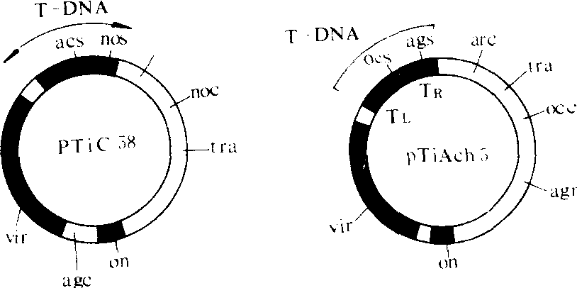 化学因子 重要的化学因子有冠瘿碱和植物激素。 冠瘿碱 是病菌基因在寄主细胞中表达的产物。能诱导寄主合成某种冠瘿碱的菌系也能利用这些冠瘿碱作为唯一碳源和氮源。冠瘿碱对肿瘤细胞中T-DNA的转录有促进作用,与肿瘤诱导与质粒转移也有一定关系。 植物激素 主要是生长素和细胞分裂素。根癌土壤杆菌在人工培养条件下可以产生上述两种激素。转化植物中,由于Ti-质粒上有关激素基因的导入,而使激素水平明显增加。主要表现: ❶肿瘤组织中激素含量增加。 ❷激素保护素增加。 ❸IAA共轭体增加。激素的作用: ❶与肿瘤发生和形态有关,产生IAA量大的菌株致病力强。 ❷与寄主范围有关,影响寄主范围的激素是细胞激动素。 遗传因子 影响肿瘤发生的遗传因子包括Ti-质粒和染色体基因组的有关基因(图1)。 Ti-质粒 是根瘤土壤杆菌诱发肿瘤的染色体外遗传因子,大质粒,分子量达90~150 × 106,含15~23万碱基对(bp)。Ti-质粒上与致瘤有关的基因主要分布在T区片段和Vir区片段上。T区片段又称T-DNA,中Ti-质粒上转移并整合到寄上细胞染色体上的 一段序列,长度约23kb(千碱基对)。T区中有控制肿瘤形态和编码冠瘿碱合成酶的基因。T-DNA两端25bp长的同向重复序列称为边界序列(border se-quence),与T-DNA的转移和整合到植物核基因组的过程有关。Vir区是Ti-质粒中T-DNA以外与诱发肿瘤有关的区域,长度约35kb,包括8个操纵子(VirA,VirG,VirB,VirC,VirD,VirE,VirH和VirF)。这些基因虽不转入植物,但对病菌的致病性是重要的。VirA和VirG的蛋白质是双组分调控系统的两个成分。VirD与T-DNA的早期加工有关。VirC与VirD的共同作用促使T区形成和T-DNA的转移频率。VirE编码一种单股DNA的结合蛋白,与T-DNA发生有关。VirB编码的许多蛋白质产物与细胞膜特性有关,如形成T-DNA通道,具有ATP酶活性和自动磷酸化作用等。VirH和VirF是在章鱼碱型质粒中鉴定出来的,其功能尚未充分研究。