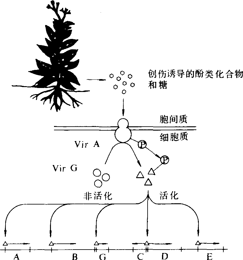 染色体基因 已鉴定出10多个基因,其中三个位点(chvA,chvB,exoC)与吸附有关。这些位点突变,由于影响吸附使病菌丧失毒性。chvA编码的蛋白质是把β-1,2-葡聚糖运送至胞外质所必需的。chvB编码的235×1000的蛋白质结合到膜上后,能将β-1,2-葡聚糖转化为环状结构。exoC编码的酶可以把葡聚糖-6-磷酸转化为葡聚糖-1-磷酸,是合成纤维素和β-1,2-葡聚糖所必需的。由于β- 1,2-葡聚糖具有多态性,可能还有一些其他因子参与细胞的吸附。 基因调控 根据蛋白质同源性研究,根癌土壤杆菌的基因调控机制是与许多双组分调控系统 一致的。第 一个蛋白质能感受特殊的环境信号,然后再把信息传递给第二个蛋白质,接着使一连串对环境敏感的基因活化(图2)。 VirA和VirG的调控 VirA蛋白是跨膜蛋白,两个亲水区把蛋白质的N末端与细胞质膜联系并有一个区域凸出到胞质中C末端留在细胞质内。VirA蛋白与植物的分子信号互作,通过自动磷酸化作用而受到活化。VirA蛋白中磷酸化的组氨酸磷酸基团再直接传递给VirG蛋白,使磷-VirG信号逐步增强。磷酸盐的转移作用发生很快,将磷-VirA蛋白与VirG蛋白混合在一起5秒钟即出现磷-VirG蛋白。在VirG蛋白中被磷酸化的是天冬氨酸。 VirG蛋 白对“Vir盒”的调控 “Vir盒”(Vir-box)是VirG蛋白识别的含12bp的保守序列,位于每一个Vir基因的上游。用跟踪技术证明在“Vir盒”的两股链上都覆盖有VirG蛋白。VirG蛋白磷酸化的增强对“Vir盒”的亲和性以及结合前对RNA聚合酶转录活性有影响。 “Vir区”对“T区”的调控 Vir区基因中有两个毒性位点D1和D2与T-DNA的加工有关,它们分别编码一种DNA局部异构酶和对T-DNA边界顺序有识别作用的核酸内切酶。因此,由Vir区基因的诱导,在边界重复顺序中形成特异性开裂点,产生包括或不包括T-DNA在内的含边界顺序的分子,实现T-DNA的转化。T-DNA进入植物的形式有可能是单股T-DNA。