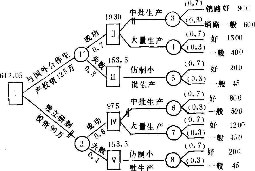 决策树图 (2) 计算期望值并进行比较: 状态结点 ❸的期望值 E(3)=900×0.7+600×0.3=810 (万元) 同理,E(4)=1300×0.7+400×0.3=1030 (万元)E(5)=E(8)=200×0.7+45×0.3=153.5 (万元)E(6)=800×0.7+500×0.3=710 (万元)E(7)=1200×0.7+450×0.3=975 (万元)在决策点(Ⅱ)处,比较点 ❸和点 ❹,∵1030>810,故选第 ❹方案 (大量生产); 在决策点(Ⅳ)处,比较点 ❻和点 ❼,∵975>710,故选第 ❼方案 (大量生产)。 又∵E(1)=(1030×0.7)+(153.5×0.3)-125=642.05(万元) E(2)=(975×0.6)+(153.5×0.4)-90=556.4(万元) 在决策点(Ⅰ)处,比较点❶和点 ❷,∵642.05>556.4,故选第❶方案。 这样,该厂对新型轿车生产问题应作这样决策: 投资125万元与国外合作生产,如谈判成功,就实施大量生产方案,期望利润为642.05万元。 ☚ 多目标决策 头脑风暴法 ☛ 决策树 决策树decision tree用于描述决策过程的树状操作程序图。具体做法是,根据所有决策方案所处的阶段及其相互联系,用树形图将所有方案表示出来。所有可能的有关情况和概率都出现在相应的分支上,然后运用概率的方法求出方案的损益值,最后按决策原则和程序进行优化。决策树是可以帮助个体处理存在多阶段和多种可能的问题的决策方法。 ☚ 决策 框架效应 ☛ 决策树 决策树用于描述决策过程的树状操作程序图。具体做法是,根据所有决策方案所处的阶段及其相互联系,用树形图将所有方案表示出来。所有可能的有关情况和概率都出现在相应的分支上,然后运用概率的方法求出方案的损益值,最后按决策原则和程序进行优化。决策树可以帮助个体处理存在多阶段和多种可能的问题决策方法。 ☚ 决策 灵感 ☛ |