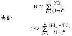 式中,GBn为项目的年度总收益,TCn为项目第n年总成本,其余同上式。一个项目的净现值就是项目寿命期各年度净现值的总和。其计算公式为: