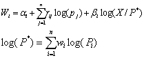 rij反映了消费品价格对支出预算份额Wi的影响,表示消费品j价格上涨1% 时,exp(Wi)的百分比变化,正负号决定上升或下降的方向。 关于X/P,P可以看作是一种价格指数,X/P表示一种“真实支出”。因P=a(p),这种“真实支出”是以几倍于基本生理需要支出计量的。X/P的变化对Wi的影响由βi表示,βi可解释为X/P变化1%时,exp(Wi)变化百分之几。一般地,奢侈消费品的βi值为正,必需品的βi值为负。 对(5)式计量估计的困难是价格指数P的测度。Deaton曾指出,指数P可以用Stone价格指数代替。1987年G·菲利普斯 (G.Phillips)等人认为,两种指数在具体应用时,所得的结论是相近的。AIDS模型的估计式(5) 变为