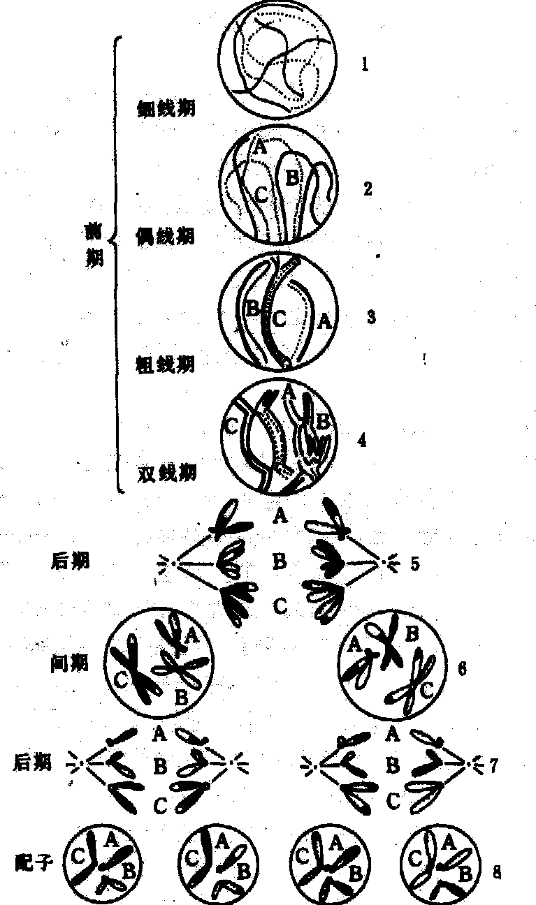 图2 联会复合体 卵母细胞则由于细胞质不等分裂,形成一大一小的子细胞,大者称为次级卵母细胞,小者称为第一极体。第二次减数分裂 第二次分裂之前,是否有间期形成,依种类不同而异。第二次分裂与普通的有丝分裂一样,每个二联体的着丝粒分裂,二条姊妹染色单体分离成二条独立的染色体,分别进入两个子细胞中。初级精母细胞经过两次分裂形成四个精细胞,最后经过转变,变成四条精子。卵母细胞的第二次分裂停留在中期,受精之后,才完成第二次分裂,细胞质又进行一次不等分裂,形成一个成熟的卵子和一个第二极体。减数分裂的结果是,一个精母细胞形成四个精子,一个卵母细胞形成一个成熟的卵子;每个精子和卵子各含单组染色体,即每对同源染色体中只有一条。 减数分裂的性别差异 在人类,男女生殖细胞在减数分裂中,除染色体的变化与行动一致外,还有许多差别。在男性胎儿时期的细精管内,精原细胞即已存在,但一直等到青春期才开始进入精子发生时期。从青春期起数十年的育龄里,不断产生精子。每个初级精母细胞,经过减数分裂和转变,变成四个精子。与此相反,在早期女性胎儿卵巢里,卵原细胞已分化成初级卵母细胞,约在第四个半月到第五个半月期间,胎儿卵巢里的卵原细胞和初级卵母细胞增殖到最大限度,约有700万个,以后逐渐退化,到出生时,只剩下200万个,其中大约有400多个在生育年龄里被排出体外。初级卵母细胞在胎儿时期即已进入第一次减数分裂,在双线期末,初级卵母细胞的染色体重新解旋,变化成松散的核网状态,叫做核网期,此时,初级卵母细胞中止分裂,并合成大量胞质,细胞迅速长大,直到青春期。从青春期起,一般是每月排出一个卵母细胞。在排卵之前,才完成第一次减数分裂,形成次级卵母细胞和较小的第一极体。绝大部分的初级卵母细胞在整个生育年龄都保持核网状态。排出卵巢的次级卵母细胞,在输卵管内进行第二次分裂,到中期停止,此时如果受精,即可完成第二次减数分裂,形成一个成熟的卵子,排出第二极体。卵子受精时卵核与精核结合,形成合子的胞核,开始新一代的个体发育。 减数分裂中染色体行动规律 在正常减数分裂中,染色体的行动规律是同对的两条染色体分开,异对的则自由组合。如人体有23对染色体,精卵结合后的组合类型有223种。Carothers (1921)发现某些蝗虫的减数分裂时正常配对的染色体,在大小和形状上有能辨别出来的差异。她观察了同一个体里染色体的行动,据染色体上可辨认的特点,从细胞学上证明了,同对的两条染色体彼此分开,异对染色体之间则自由组合(图3),因为基因位于染色体上,所以从细胞学上证实了孟德尔式分离与自由组合定律。由于减数分裂和受精中染色体的行动和重组,于是保证了亲代与子代染色体数量上的相对恒定性,同时也造成了子代个体之间的差异,因而使同种生物的各个世代之间以及个体之间的形态特点基本相同而又不尽相同。 减数分裂中染色体的特殊现象是联会与交换。联会是交换的条件,但联会的机理至今尚未明确。交换的结果,表现为交叉。 同源染色体之间发生部分交换,从Stern (1931)的果蝇杂交实验中可得到证实。实验用雌果蝇的两条X染色体形状不同,很容易识别:一为L形,由Y染色体易位到X染色体上而形成的; 另一条X染色体断裂成两个片段。把这种雌果蝇同雄果蝇交配,子代果蝇除亲代雄果蝇X或Y染色体外,从母蝇传来的一条X染色体共有四种不同的形状: 两种与母蝇两条X染色体相同,即一种为L形X,另一种为由二个片段所成的X,反映同对的同源染色体彼此分离,这两种占子代的多数。另有两种X染色体:一种X染色体表现正常形状,另一种X既有一个较短的L形片段,又有一个小的片段,这两种X占子代的少数,说明母体里有少数卵母细胞的两条X染色体