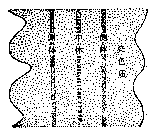 图4 真核细胞中减数分裂发生的时间部位的三种类型阴影处为生活周期中的二倍体时间 SC的结构 SC是应用电镜观察蝲蛄精母细胞二价染色体时发现的,以后在动物的卵母细胞和植物的减数分裂中都得到证明。SC位于两条同源染色体之间,沿纵轴方向延伸。两侧为侧生组分,宽为20—40nm,电子密度高。两侧生组分间为中间区,宽约100nm,中间区在电镜下比较明亮。中间区的中央为中央组分,比较暗,宽约30nm。侧生组分之外为染色质,不同生物或者浓密或者疏松。侧生组分和中央组分之间有横向排列的纤维,大致成直角相连,称之为L-C纤维,长约60—70nm,L-C纤维之间距离20—30 nm。而使SC结构像一架梯子,呈扁平带状。SC主要由碱性蛋白和RNA组成,含有微量的DNA(图5)。