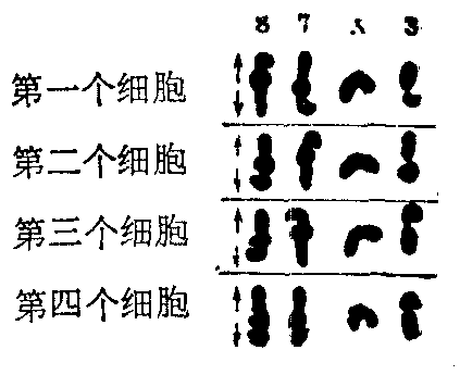 图3 昆虫减数分裂中期末异对染色体之间的自由组合方式(仿Carothers) 图示四个细胞中接近后期的染色体3号、7号、8号和X染色体的排列情况,每号染色体的两条同源染色体用上下两段代表,形式彼此不同,X染色体只有一条。根据四对染色体在赤道板上的排列,可以肯定四对染色体之间是自由组合的,箭头示后期同源染色体分离的方向