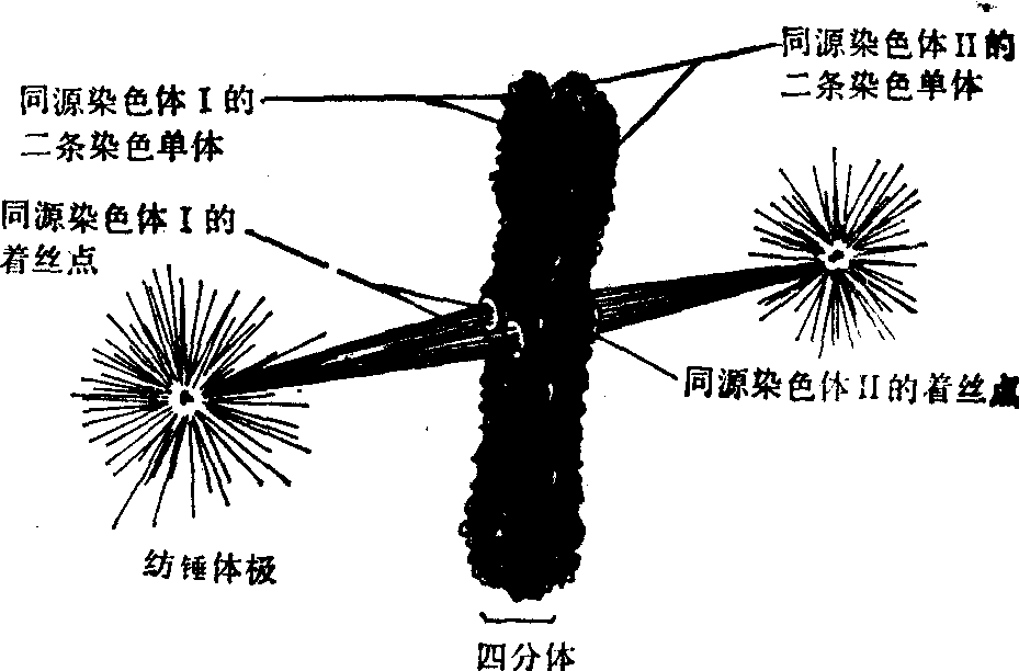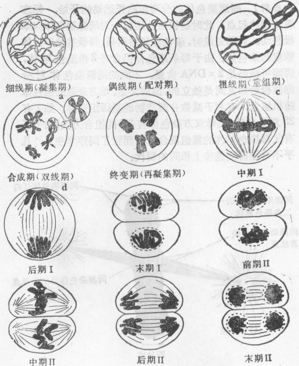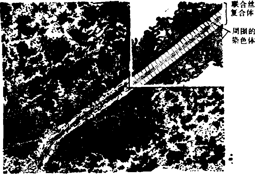 图1 减 数 分 裂 (1) 前期Ⅰ(Ⅰ指第一次减数分裂,以下同):又可分为细线期、偶线期、粗线期、双线期和终变期五个时期。 细线期: 染色体在前减数分裂期很难辨认。在细线期,每条染色质丝虽然含有两个DNA双螺旋,但在表面上只能看到一条舒展松散的细线。在这个时期,有些种类的染色体一端或两端靠近核膜,并集结在一处,形成所谓“花束”。 偶线期:偶线期的主要特点是来自父方的一条和来自母方的一条,在形态上和遗传上都基本相同的同源染色体相互配对。两者从一点或几点开始逐步在全部染色体的相同位点上配对接合,这一接合配对过程叫做联会。人类生殖细胞里的22对常染色体就是这样配对的,只有性染色体X和Y则是末端相接。同源染色体配对完成后,原来细线期细胞中的46条(2n)染色体表面上变成了23条(n),这种由二条同源染色体组成的复合结构称为二价体,具有两个着丝粒。在电子显微镜下,在同源染色体之间可以看到一个纵行的联会复合体,与两侧同源染色体平行。联会复合体两侧为电子密度较高的物质组成,称为侧体,中央有中体(图2)。其构成成分尚未确定。联会复合体的存在可能与染色体的分子配对和交换有关。近来亦有人用镀银染色法,在光学显微镜下,在人的生殖细胞的偶线期看到联会复合体。 粗线期: 本期特点是二价体螺旋化程度不断增加,染色体不断缩短变粗。二价体内每条同源染色体已各自分裂成两条子染色体,借一个着丝粒连在一起,称为姊妹染色单体。这样,每个二价体由四条染色单体构成,叫四联体。在粗线期末,同源染色体的非姊妹染色单体之间发生局部断裂,随后发生部分遗传物质的交换。 双线期: 这个时期的特点是四联体中的同源染色体之间出现纵裂,表明同源染色体开始分开,同时联会复合体也逐渐消失。同源染色体的某些部位彼此连接,这种连接点叫做交叉,是由于交换而形成的细胞学表现。交叉的形式多样。一般认为,有一个交叉就代表一次交换。终变期: 染色体螺旋化程度更高,所以更为粗短,形成各种形状。核仁和核膜消失,纺锤体开始形成。四联体分散于核膜附近。 (2) 中期Ⅰ:纺锤体形成,四联体的着丝粒排列在赤道面上,有两条牵引丝分别与两条同源染色体的着丝粒相连。 (3) 后期Ⅰ:由于牵引丝的作用,四联体中两条同源染色体分开,分别向细胞的两极移动。每一极只能获得每对同源染色体的一条,叫二联体,这就是实际上的减数分裂。至于四联体中的二联体移向哪一极,完全是随机的。(4) 末期Ⅰ: 核膜和核仁重新形成,细胞质分裂,形成两个子细胞。初级精母细胞分裂成两个次级精母细胞,而