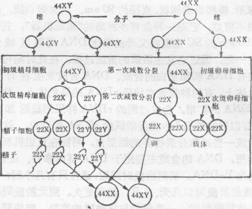 图1 减数分裂中期纺锤体与着丝点相连的图解 末期Ⅰ及间期 在自然界中,末期Ⅰ和间期的类型有二:一种是没有明显可见的染色体去凝集,另一类型是完全逆转到间期核的状态。后者染色体去凝集,核被膜形成围绕两极的染色质。然而大多数种类,末期Ⅰ和间期是在第一次及第二次减数分裂期之间的短暂停顿,在所知的生物中未见有DNA合成。 第二次减数分裂和有丝分裂过程基本相同,可分为前、中、后、末期。如在末期Ⅰ及间期中染色质已经去凝集,则前期Ⅱ染色质重新凝集。中期Ⅱ染色体形成致密的短棒状,排列在赤道板上,每条染色体上的着丝点分别和两个不同极的纺锤丝相连。后期两组染色体拉向两极,其结果每极为1×DNA含量,相当于进入减数分裂的原G2期细胞DNA含量的1/4。末期Ⅱ重新组成核被膜,染色质去凝集,形成四个单倍体细胞(图2)。 所形成的四个核在不同动、植物种类其最终的命运也有所不同。雄性动物形成的四个核为胞质所包围,进一步分化成有功能的雄性配子——精子。雌性动物减数分裂所形成的四个配子中,由于卵的胞质不均匀分裂,胞质集中于一个大的卵细胞中,发育成有功能的配子,在卵的一极形成胞质极少的小细胞,无功能,称之为极体(图3)。高等植物发育类型与动物相似,花药中减数分裂产生的四个产物,形成花粉的“精子”核。在雌蕊子房中经减数分裂,仅有一个发育成卵子核。 大多数动物和少数植物雌性细胞性染色体为XX,雄性细胞为XY或XO。X、Y染色体配对时有部分结合和重组;后期Ⅰ时X、Y染色体分别分向两极;后期Ⅱ时X、Y染色体分别分到四个子细胞中去。XO型中,后期Ⅰ时X分到一个子细胞中,另一细胞为O,后期Ⅱ时四个子细胞性染色体的分配为X、X、O、O。