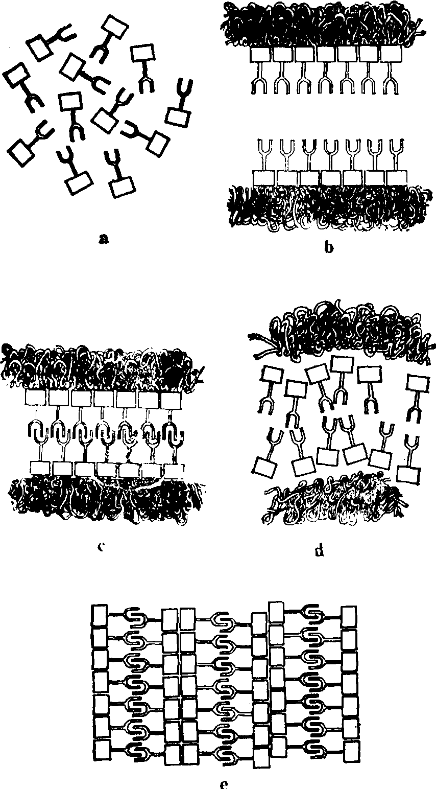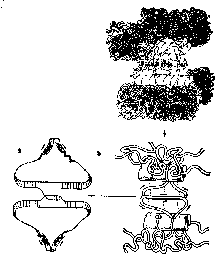图5 蝗虫粗线期的SC框内为SC与染色质纤维之间的关系图解 SC的形成与去组装 当细线期同源染色体尚未配对时,通过横切面的细致分析,可见有一条侧生组分的轴心位于2条姐妹染色单体之间的缝隙中,而且和染色质密切联系。此时若用Bernhard EDTA染色,侧生组分呈负结果,并可一直持续到配对时,说明侧生组分在充分配对和SC完全形成之前没有RNA与之结合,因而也可以说RNA分子在同源染色体联会中不参与识别过程。减数分裂前的G2期或早前期Ⅰ,对减数分裂信号刺激作出反应,SC的单体在胞质中合成,通过核被膜进入核内,在核内达到高浓度,受到和染色体结合的一些因子的作用,促进亚单位组成侧生组分轴心。两条侧生组分轴心逐渐靠拢,直到距离达100 nm左右时,二者大量横向垂直伸出的纤维,互相交错形成中央组分。继而单链Z-DNA序列或RNA、蛋白质序列识别分子组合到SC之中,进一步促进同源染色体的紧密整列,这时SC便可提供有组织的网络,稳定联会,提供分子配对和与重组活动有关的因子及酶。有人认为侧生组分轴心蛋白亚单位是根据染色质上每一基因位点的严格指导,组成一种结构构型,与另一条相应装配起来的构型相似的轴心可相互识别而结合。联会多由核被膜一端开始,像拉链一样使两条染色体联会到一起。联会后在粗线期进行DNA重组,同源染色体之间交换染色质断片,故在粗线期、双线期有交叉出现。到双线期时同源染色体之间分开,因核条件的改变,推动平衡向单体库方向移动,SC去组装,大多数有机体亚单位分散到核质及胞质中去。有少数种类亚单位局部重组为多聚复合体,以此形式暂时贮存,直到崩解(图6)。 重组发生的机制 细胞经过染色体重组,造成一些染色体上基因序列改变,是由于同源染色体之间染色体片断交换的结果。两同源染色体均向SC伸出襻环,经过L-C纤维直达中央组分,直到距离约1nm时分子可以互相识别。襻环处于连续运动之中,在中央组分中进行碱基序列的连续比较,一直到同源序列排在一起,这时在分子水平上发生DNA链的断裂、交换,最后达到DNA的重组。配对阶段所需时间,反应了包含在单体中的纤维进行序列比较所需的时间。这一过程触发了一系列的酶促活动,如DNA内切酶可将DNA链切断,DNA外切酶可将暴露在外的单链DNA切掉,DNA聚合酶可以填补间隙,解旋酶可使切断的DNA链展开,连接酶可连接DNA链的切口等。大量实验证明,百合中β型核酸酶在偶线期上升,粗线期达高峰,粗线期末消失。3H-TdR标记实验也可见在粗线期有掺入。偶线期末到粗线期连接酶活性上升。粗线期有P-DNA合成,不同于Z-DNA,是由非常短的断片组成,如抑制此种DNA的合成则染色体断裂,故P-DNA在断口修复中起作用(图7)。