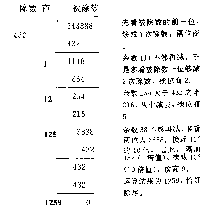 单纯用累减法, 有时为求得某一位商需要连减多次,仍觉不便。考虑除数的1、2、5倍值,它们可以组成除数的1—9倍值中的任何一个:3=1+2;4=2+2=5-1;6=5+1;7=5+2;8=10-2;9=10-1。由于除数的1倍值(包括10倍值)即其自身,2倍值可直接由心算得到,5倍值相当于折半。也容易由心算得到,因此,利用除数的1、2、5倍值通过减法求商,可以进一步简化运算。例如:543888÷432=1259,计算过程如下: