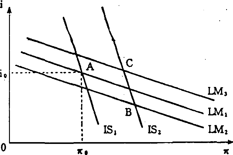 图中的直线LM则代表当x、v和θ不变时,i与π的组合,该组合满足 (12)式。由于π的上升导致了资本的预期名义收益率r (x) +g(π) 和债券的名义利率i+g(π)的上升; 用实物资本和债券是货币的替代品,故实际余额的需求就会减少。通过市场机制的作用,实际利率必然下降,以维持实际余额供需间的平衡。因此,i与π的运动方向仍然是互逆的,这说明LM直线的斜率仍然为负。 斯泰因根据上述IS和LM曲线检验了v的变化对π和i的影响,并得出结论: 在x不变的情况下,v的增加将使IS曲线向上移动,LM曲线向下移动。从图中看,当v从v0上升到v1时,IS曲线从 (v0,x0)上升到 (v1,x0),而LM曲线则从(v0,x0)下降到 (v1,x0)。IS曲线和LM曲线所表明的v的变化对π和i的影响的结果是完全相反的。那么,v的变化对π和i的影响究竟如何呢?这就要看两条曲线的斜率的相对大小了。如果LM线的斜率较大 (如图所示),当v从v0增加到v1时,i就会自i0降至i1,而π则会从π0上升到π1; 反之,若IS线的斜率较大,v的增加就会使i上升,π下降。 期泰因还根据IS和LM曲线检验了x的变化对π和i的影响。对于IS曲线来说,在v不变的情况下,若x上升,资本的边际产出r (x) 和资本的平均产出y(x) 都会提高。根据 (10) 式,意愿储蓄和意愿投资将由此而分别增加s1y′ (x) 和r′ (x)。这时,如果投资的增加大于储蓄的增加,即r′ (x)) s1y′ (x),π就会上升(假定i不变); 反之,如果r′ (x)