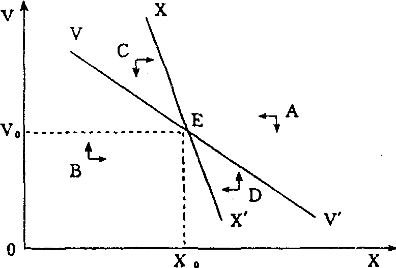 斯泰因认为,如果经济偏离XX′线或VV′线的轨迹,就会有一些力量使它重新回到这一轨迹中。如图所示,如果储蓄与投资的均衡点脱离了XX′线,而处在A、B、C、D的任何一点上,则x将沿着横向箭头朝XX′线移动。这是因为,由x的变化而引起的资本边际产出的变化大于利率的变化。当x处于XX′线的右边 (如D点)时,若v保持不变,资本投资的增加就会超过劳动力的增加,x也就趋于下降,而向XX′线靠拢; 当x处于XX′线的左边(如C点时),情况正好相反。同样,一旦实际余额的供给和需求的均衡点脱离了VV′′线而处在A、B、C、D的任何一点上,v就会沿着纵向箭头朝VV′线移动。这是因为,当v上升而超过VV′线时,若x不变,利率就会下降,物价就会上升。随着资本收益的相对提高,资本存量将增加。由于v是货币与资本之比,资本增加就意味着v的下降。反之,当v下降而低于VV′线时,情况正好相反。