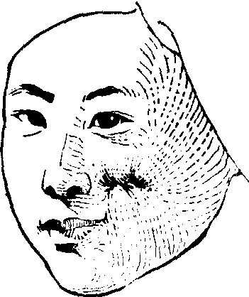 图1 左颊部的凹陷瘢痕 凹陷瘢痕如为面积较小较浅者,可用局部瘢痕组织充垫法治疗。即只将瘢痕的表皮削除,保留其深层组织以供充垫凹陷之需。然后充分剥离两侧皮下组织,将创口直接缝合。凹陷即可消失,外观得以改善(图2)。如为面积较小但较深的凹陷瘢痕,则须视所在部位,采用局部脂肪瓣或肌瓣的移转,或真皮、脂肪、筋膜、软骨、骨组织的游离移植,或组织代用品的植入等方法,才能将凹陷完全充垫平整。切除瘢痕后的创面,于游离创缘后直接缝合。如为面积较大且较深的凹陷瘢痕,切除瘢痕后的创口不能直接缝合时,则需行皮瓣、皮管或肌皮瓣手术,同时或后期另行深部组织如肌腱、神经、骨骼等缺损的修复,以恢复功能和改善外形。
