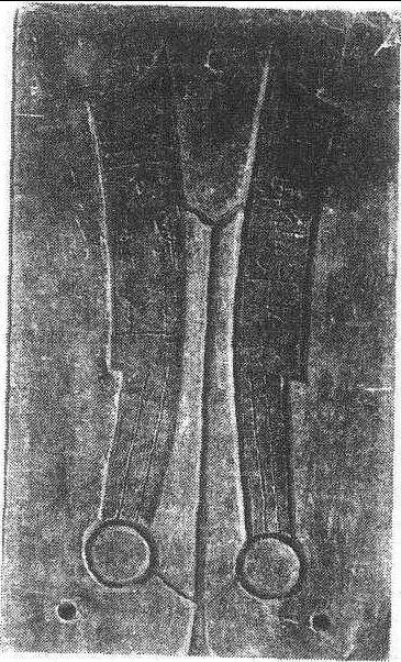 | 释义 | 刀币石范战国 (约公元前348—284)齐国刀币石范,长21.5,宽12.5,厚2.7厘米。存有阴刻平行线模2枚。左枚为面模,刀身部有阴刻反书“莭墨之大化”5字;右为背模,上部阴刻“≡”三横道,其下阴刻反书“辟邦”2字。两钱模均长17.8,宽3厘米。刀柄部均有阴刻平行线两条。石范上部浇铸口宽1.4,道长14,宽0.4厘米,位于两钱模之间,有支槽与钱模相通。两刀头尖,两刀柄下共有3个小凹坑,铸造时用以对准上下范位置。“莭墨之大化”齐易刀留世无多,而此范愈显珍稀。旅顺博物馆收藏。