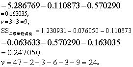 (3)分别计算上述六个部分的均方MS(=SS/v),见表3。
