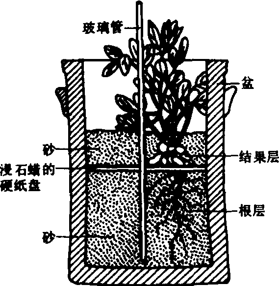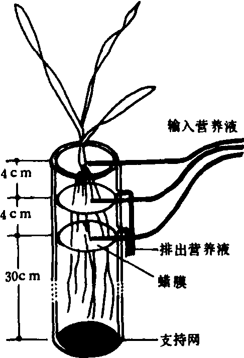 分根培养试验split root culture experi-ment将同一植株的根系分隔在不同营养环境中的培养试验。主要用于根系营养特性研究,也可用于根系与地上部分养分运输的相关性研究。分根培养可按照根系生长介质的性质不同分为:❶液体—液体分根培养。 ❷液体—固体分根培养。 ❸固体—固体分根培养。固体生长介质又可依试验目的选用土壤或砂粒。简单的分根培养可用不同容积的容器套在一起组成。液体—固体分根培养一般内部容器为液体,外部容器为固体介质,以便固定内部容器位置。用弹簧或带孔的塞子将植株固定在内部容器壁上,根系分别生长在内外容器中。上下双层分根培养的花生试验如图1,属于固体—固体分根培养。 近代的分根培养是将根系纵向分隔或横向分隔,根系穿过透水的有孔隔板(图2)后,用硅胶封闭。或用熔点45℃可容根系穿过蜡质隔板及有营养液输入输出管道。根系生长的介质可为土壤、砂或营养液。纵向分隔的分根容器可用注射器注入营养成分。