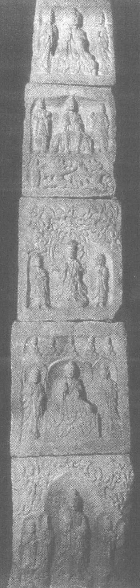北魏。通高218厘米,底宽44厘米,厚44厘米。甘肃省庄浪县出土,甘肃省博物馆藏。塔计五层,分石雕制后重叠而成,呈阶梯状自下而上依次递减。每层三面造像。正面龛内皆以佛为本尊,其或站或坐,呈不同姿态,佛两旁自上而下,每层分别雕以胁侍菩萨、弟子、天王。龛上方和下方刻以怪兽、飞天、小坐佛等。塔左、右两侧刻佛本生和经变等故事。