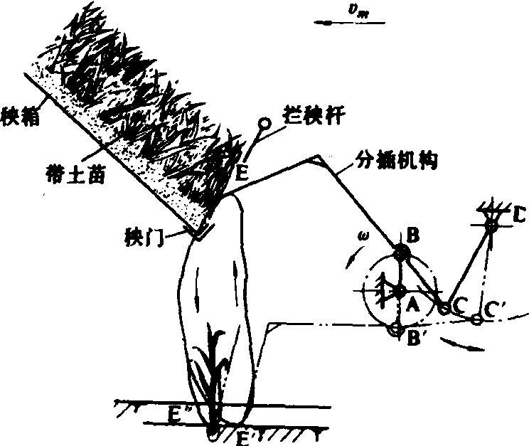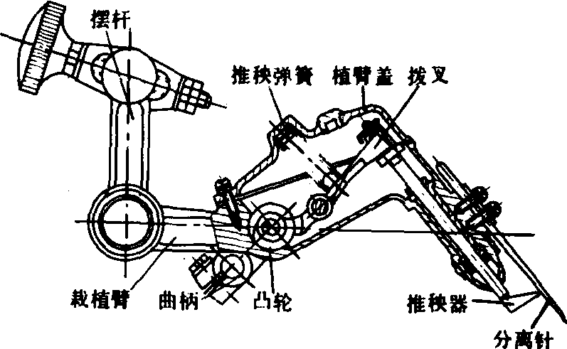 图1 纵分往复直插原理 应用往复直插式分插原理的机构型式有多种,其中得到广泛应用的是曲柄连杆式机构(图2)。曲柄紧固在传动轴上,另一端与栽植臂铰接,栽植臂又与摆杆铰接。摆杆一端与机架为固定铰接,这个铰接点的位置可在一定范围内调节,用以调整分离针的取秧深度和高度,满足取秧量的要求。推秧器由凸轮、推秧弹簧和拨叉控制,分离针插秧后,推秧器把秧苗从分离针上推出。曲柄连杆式分插机构运转平稳,转动副均密封,不易磨损。在传动轴上设有安全离合器,使用可靠性较好。但构造较复杂,造价较高。