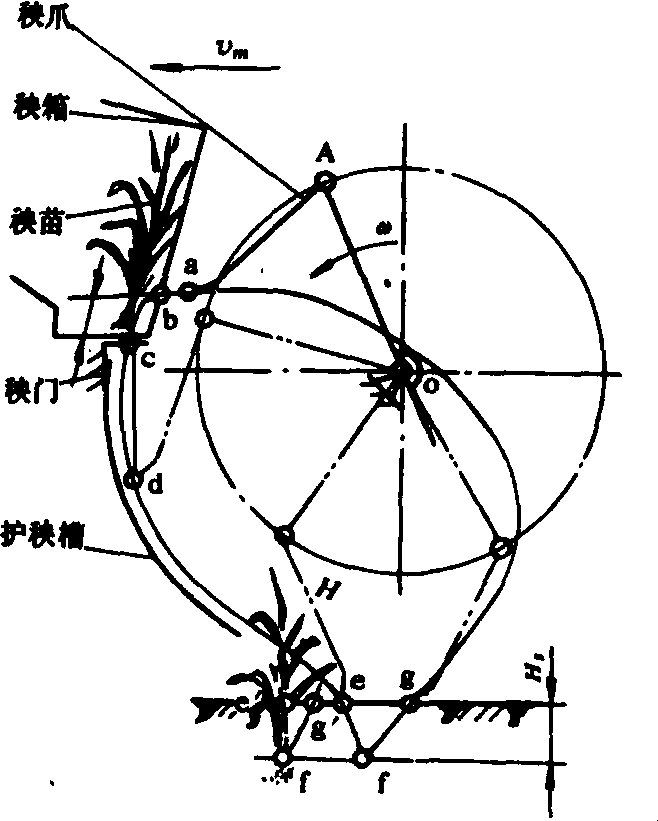 图2 曲柄连杆式分插机构 纵分滚动直插式 采用由两排或三排秧爪排组成的分插轮等速回转,同时由轨迹控制机构控制秧爪尖的运动轨迹,完成分秧、插秧、出土、回程等过程。多应用于秧苗较长的拔取苗机动插秧机,也能适应无土育秧和薄土育秧小苗。加大秧爪取秧面积和加装推秧器后也用于栽插带土苗。分插原理如图3所示。秧爪在a点准备进入秧箱,在b点接触秧帘,b点至c点距离Hq为取秧高度。根据秧根长短,可调节取秧高度。如秧根很长而取秧高度过低,则取秧量不足,均匀度差甚至漏插多;如秧根短而取秧高度过高,则勾、伤秧率增高。秧爪进入秧帘的垂直距离,即取秧深度,视要求的取秧量和秧苗情况(拔取苗为秧苗粗细,无土、薄土和带土苗为播种密度)而定, 通过更换不同尺寸的秧爪和调整秧帘与秧箱的相对位置来调节。分秧段轨迹应与秧帘平行, 即沿秧苗轴线方向往下分秧。自c