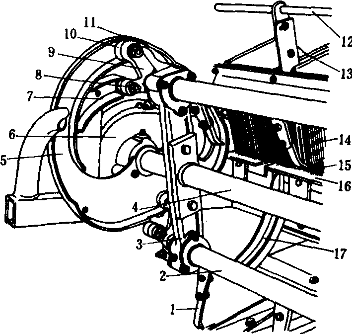 图4 转臂滑道机构 1.秧爪;2.秧爪排;3.分插轮转臂;4.分插轮轴;5.主滑道;6.链轮箱;7.副滑道;8.小滚子;9.拐臂;10.大滚子;11.可换取秧滑道;12.拦秧杆;13.秧箱; 14.钢丝帘;15.阻秧毛刷;16.秧门角钢;17.护秧槽 转臂滑道式分插机构(图4)是在实际生产中应用纵分滚动直插原理的一种机构型式,由转臂和滑道机构组成。秧爪排与转臂为铰接,装有大、小滚子的拐臂固接于秧爪排外端,大滚子在主滑道内运转,即可控制秧爪的运动轨迹。为适应根长不同的秧苗,取秧段滑道可以更换,调整秧爪的取秧高度。为了达到在不同穴距工作时秧苗都能插直和插孔较小避免漂秧,秧爪在插秧段和出土段都不受滑道控制,即在一定范围内大滚子失控。副滑道的作用是克服机构运转的死点,用以控制小滚子,使运转顺利。 转臂滑道机构的优点是工作可靠、运转灵活,使用方便,尤其是对穴距适应范围较大(100~200毫米)。但滚子和滑道较易磨损。磨损后需更换备件。 选型依据是根据秧苗长短选择分插轮直径。秧苗长度为150~350、150~450和150~480毫米,分别选用分插轮直径280、320和360毫米。 |