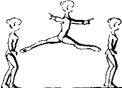 基本跳步之一。指双腿原地起跳空中前后(或左右)分腿,然后单腿或两腿先后依次落地的跳步。动作要领(向前分腿跳):左脚在前的丁字步站立,手成一位手预备。前奏1~3拍不动,4—半蹲,后半拍两脚蹬地向前上方跳起,空中前后分腿(后腿稍高),上体正直,右臂前平举,左臂侧平举。1—左脚落地屈膝半蹲,右腿后举;2—右脚落于左脚后成丁字步半蹲。3—还原成预备姿势。4—同前奏第4拍。教学重点:初学者不要求跳的高度,而是两脚向前向远做有力的蹬地跳起,两腿在空中迅速直膝分腿,身体正直稍向前倾。