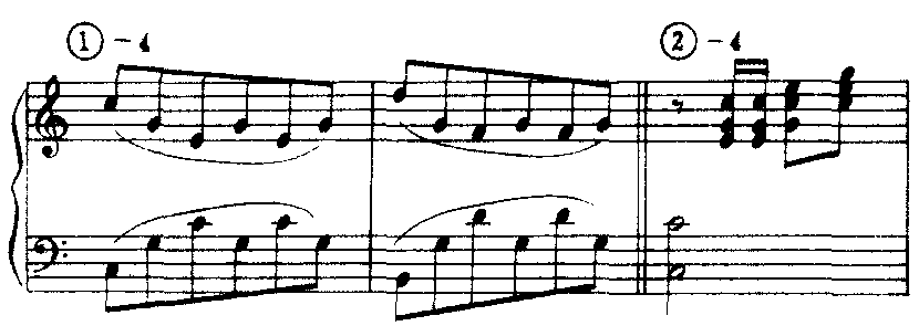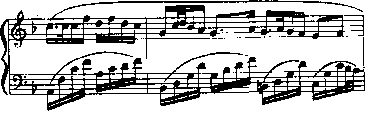 ❶突出线条的分解和弦音型。这种音型把和弦音都分解开来,构成线条。其线条可能是直线形的,也可能是曲线形的;可能是单层的,也可能是双层或多层的。它们大多用于抒情性乐曲或歌曲的伴奏中。
