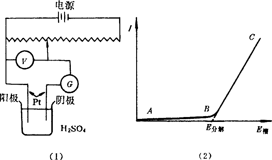 | 释义 | 分解电压 分解电压fenjie dianya使某电解质溶液继续不断发生电解所需的最小外加电压称为该电解质的分解电压。例如,用铂电极电解0.5mol·L-1H2SO4溶液(见图(1)),当外加电压逐渐增加时,通过电解池的电流也略有增加。但只有电压增到1.67V(图(2)中的E分)时,电流才随电压迅速上升,同时两极连续不断析出氢气和氧气。1.67V就是电解0.5mol·L-1H2SO4的分解电压,也叫实际分解电压,它大于理论分解电压(1.23V)。