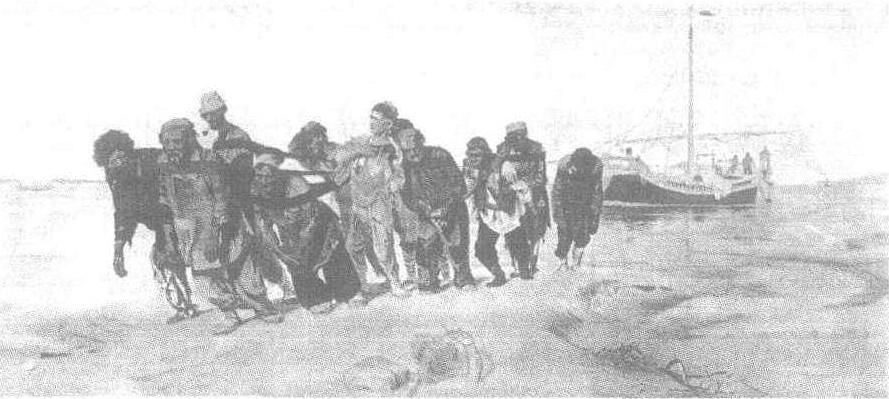 | 释义 | 列宾《伏尔加纤夫》 列宾《伏尔加纤夫》烈日当空,在辽阔的伏尔加河畔,一群衣衫褴褛的纤夫拉着帆船,从荒凉的沙滩上缓缓走来。从他们沉重的步伐中,似乎可以听到压抑而低沉的 “伏尔加船夫曲” 的回声: