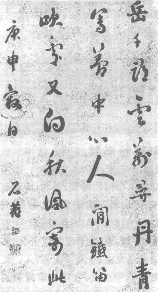 | 释义 | 刘墉行书轴 刘墉行书轴清。纸本。纵126.6厘米,横58.9厘米。山东省济南市博物馆藏。刘墉(清康熙五十八年—嘉庆九年,即公元1719—1804年),字崇如,号石庵、青原、香岩、日观峰道人。山东诸城逢戈庄(今属高密县)人。乾隆十六年进士,官翰林院编修累协办大学士,嘉庆三年授体仁阁大学士,四年加太子少保衔,卒,晋赠太子太保,谥文清,入祀贤良祠。刘墉通经史百家,工书,擅小、中楷,取法董其昌,兼师颜真卿、苏轼诸家,70岁潜心北朝碑版。其书喜用浓墨,落笔厚重,骨力内藏,时称“浓墨宰相”。时与翁方纲、梁同书、王文治并称“四大家”。清徐珂《清稗类抄》云:“文清书法,论者譬之以黄钟、大吕之音,清庙、明堂之器,推为一代书家之冠。盖以其融会历代诸大家书法而自成一家,所谓金声玉振,集群圣之大成也。”清包世臣《艺舟双楫》云:“文清少习香光,壮迁坡老,七十以后,潜心北朝碑版,虽精力已衰,未能深造,然意兴学识,超然尘外。”著有《石庵诗集》。《清史稿》卷三百二有传。由此书后款署“庚申”,可知此书是刘氏82岁高龄时所作,是晚年之作。用笔沉着有力,墨气深酣古醇,结体紧练,貌丰骨劲,与当时传统帖学的轻柔与外露相比,笔法深秀,体格回旋,韵味无穷,给人以耳目一新之感。
