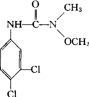 性能 纯品为白色结晶,熔点93~94℃。24℃时蒸气压为1.99×10-3帕。24℃时在水中溶解度为81毫克/升; 易溶于丙酮,中等溶于乙醇、芳烃,难溶于脂肪烃。在熔点下和水中都是稳定的。遇酸、碱、在潮湿土壤中或在高温下都会分解。无腐蚀性。原药纯度≥94%。低毒。大白鼠急性口服LD50为4000毫克/千克,狗急性口服LD50为500毫克/千克。兔急性经皮LD50>5000毫克/千克。在豚鼠皮肤上用10%水悬浮液处理引起轻微至中等程度的刺激,无过敏反应。两年饲喂试验,每千克饲料对大白鼠和狗无作用。剂量为125毫克/千克; 8天饲喂试验: 每千克饲料绿头鸭LC50为3083毫克/千克; 日本鹌鹑LC50>5000毫克/千克; 96小时喂养试验,蓝鳃太阳鱼和虹鳟鱼的LC50为16毫克/升。具有内吸和触杀作用,主要通过杂草的根部吸收,也可被叶片吸收。抑制杂草的光合作用,使杂草饥饿而死。对杂草种子萌发没影响,只有当杂草种子内的养料耗尽后,幼苗才死。土壤中残效期100~120天。 应用 制剂为50%可湿性粉剂。用于大豆、玉米、高粱、棉花、马铃薯、胡萝卜、芹菜、水稻、小麦、花生、甘蔗、果树、葡萄以及苗圃等地,防治稗草、牛筋草、狗尾草、马唐、蓼、藜、马齿苋、鬼针草、苋菜、猪殃殃、眼子菜、豚草等。大豆、玉米、高粱地,每公顷用50%可湿性粉剂2250~3000克进行苗前土壤处理; 或用1200克加1500克48%拉索乳油喷雾土壤处理; 也可与杜耳、毒草胺混用; 大豆田还可与氟乐灵混用土壤处理。大豆田使用,要求播种深度为4~5厘米,过浅易产生药害。棉田使用,每公顷用50%可湿性粉剂1875~2250克进行播后苗前土壤处理,过量,易产生药害。冬小麦田使用,播后苗前每公顷用1500~1950克喷雾土壤处理。水稻田,每公顷用1200~1500克防治眼子菜。苗后茎叶处理,药液中加入0.6%表面活性剂,喷药位置不得超过作物高度的1/3,防止药液落到作物叶面上产生药害。土壤有机质含量低于1%或高于5%的田块不宜使用;砂性重,雨水多的地区不宜使用。敏感作物有甜菜、向日葵、甘蓝、莴苣、甜瓜、小萝卜、烟草、茄子、辣椒等。喷雾器具使用后要清洗干净。 利谷隆linuron取代脲类选择性除草剂。化学名称为3-(3,4-二氯苯基)-1-甲氧基-1-甲基脲。化学结构式如下。纯品为白色结晶固体,熔点93~94℃,24℃时蒸气压为2×10-3Pa,微溶于水及脂肪烃,易溶于丙酮、乙醇、苯、甲苯、二甲苯等有机溶剂。在溶点下和溶液中稳定,在酸、碱及潮湿土壤中缓慢分解。芽前或芽后除草剂,具有内吸和触杀作用,主要通过杂草根部吸收,叶、茎吸收较少。在含叶绿素部分,抑制杂草的光合作用,阻碍希尔反应,破坏碳水化合物的形成,使植物饥饿致死。主要用于玉米、棉花、大豆、冬麦、高粱、花生、马铃薯、甘蔗、菜豆、豌豆等以及果园防除稗草、马唐、狗尾草、看麦娘、野燕麦、鸭跖草、铁苋菜、马齿苋及藜等一年生单子叶和阔叶杂草。对人、畜低毒,大鼠急性口服LD50为4 000 mg/kg,对鱼类低毒。