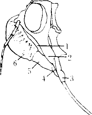 刺吸式口器(蝉)外面观 1.舌侧叶 2. 下颚叶 3. 下唇 4. 上唇 5. 前唇基 6.后唇基 刺吸式口器 刺吸式口器cixishikouqi昆虫口器的一种类型。如蝉等的上下颚特化成口针,下唇延长成1个槽管,管内包藏口针,上颚口针粗,末端有倒刺,下颚口针细,内壁有糟管,合抱一起形成食物道和唾液管,整个口器形成针状的管。吸食时,仅将上下颚组成的口针插入植物组织中吸食液汁。雌蚊的下唇延长成针状喙,在背面的唇槽内藏有由上唇、上下颚和舌特化成的细长口针。食物道由上唇内凹形成。6条口针可用作刺吸其他动物体内的血液。