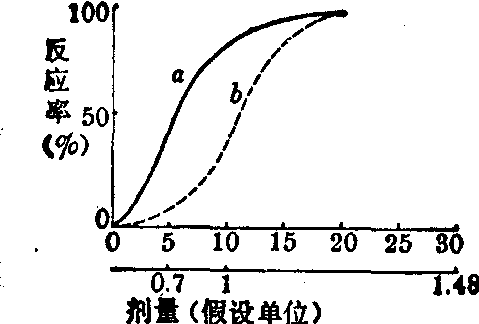 不对称S状曲线 (曲线α,剂量用自然数坐标)转换为对称的S状曲线(曲线b,剂量改用对数坐标) 对称的S状曲线 (曲线b,反应率用%)转换为直线 (直线c,反应率改用机率单位)