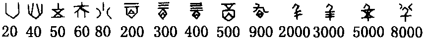 十、百、千、万的倍数在甲骨文中则用合文写成,如: