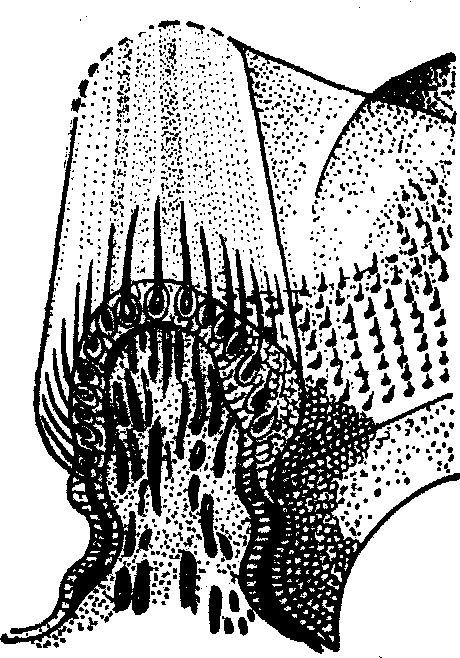 图3 壶腹嵴动纤毛排列方向 当动纤毛朝向感觉细胞的动纤毛所在侧弯曲时,感觉细胞产生较大的电活动性; 向对侧弯曲时,则电活动性较小。水平半规管壶腹嵴的动纤毛位于每个感觉细胞表面的椭圆囊端,当向椭圆囊端弯曲时,细胞电活动性大。垂直半规管壶腹嵴的动纤毛位于远离椭圆囊端之处,当向离开椭圆囊方向弯曲时,细胞电活动性大。在椭圆囊斑两缘的动纤毛相向排列; 而在球囊斑,两缘的动纤毛彼此方向相背(图4)。