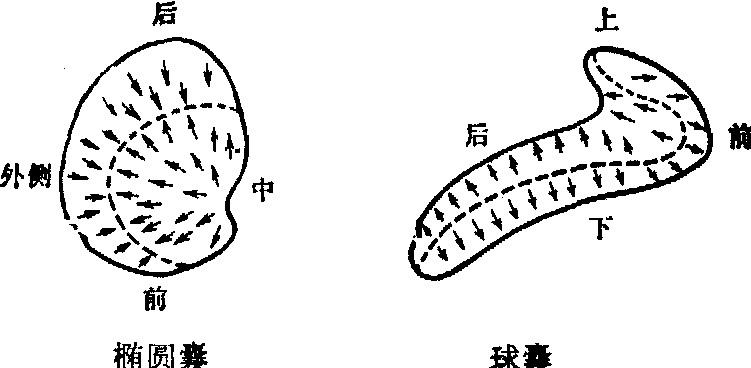 图4 椭圆囊斑和球囊斑动纤毛的极性排列 前庭感受器的功能 一般认为,角加速度是半规管的适宜刺激,直线加速度是耳石器官的适宜刺激。关于半规管神经末梢感受角加速度刺激的机理今仍未完全阐明。根据流体动力学理论,每当头部作角加速运动,使半规管获得角加速度时,由于壶腹顶-内淋巴系统的惯性,内淋巴液乃朝相反方向流动,使壶腹顶移位而刺激毛细胞。毛细胞纤毛弯曲,通过机械-电能转换机制将信息传入中枢。当角加速度为零时,壶腹顶靠自身弹性又可恢复到静止位置。有人认为壶腹顶-内淋巴系统相当于一阻尼扭摆系统,并给出微分方程如下: